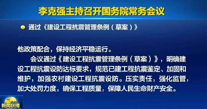 2021年5月12日,李克強(qiáng)總理主持召開(kāi)國(guó)務(wù)院常務(wù)會(huì)議,通過(guò)《建設(shè)工程抗震管理?xiàng)l例(草案)》,明確新建、改擴(kuò)建建設(shè)工程抗震設(shè)防達(dá)標(biāo)要求及措施,規(guī)范已建成建設(shè)工程的抗震鑒定、加固和維護(hù),加強(qiáng)農(nóng)村建設(shè)工程抗震設(shè)防。